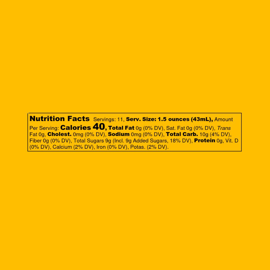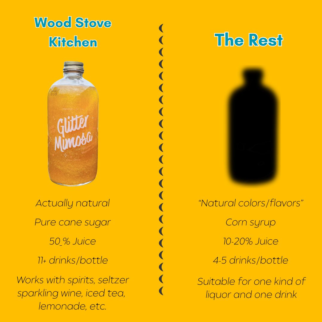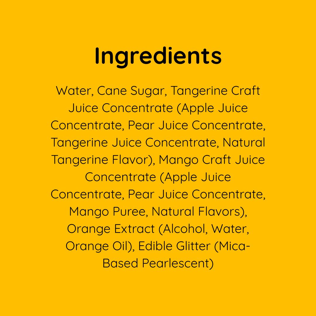 This delicious mixer combines tangerine and mango with FDA-approved edible glitter. It is highly concentrated, so just add a half ounce to one ounce to a glass of sparkling wine, seltzer, sparking juice, or even lemon-lime soda. We also love it with a dash of rum on the rocks.