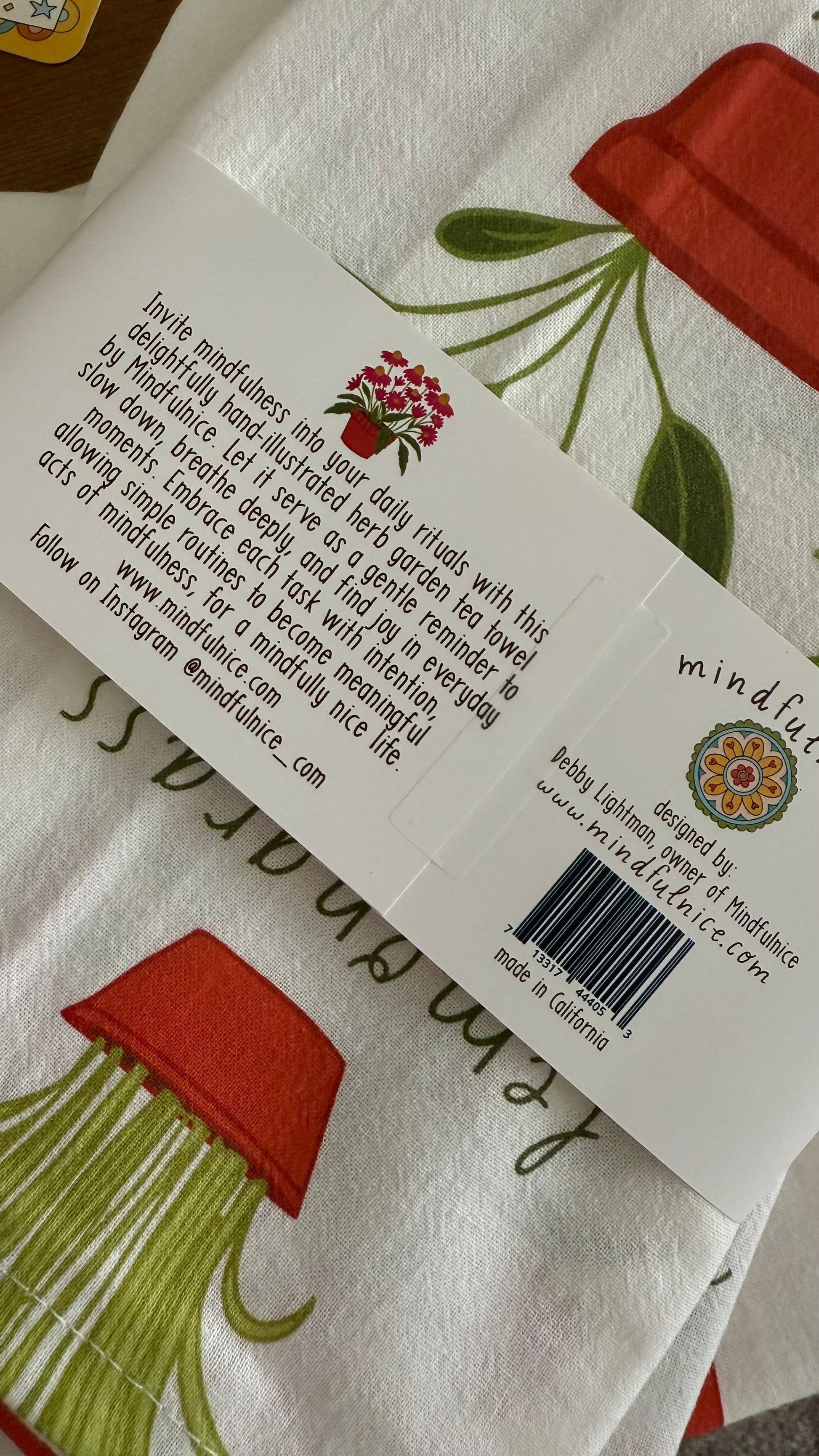 Invite mindfulness into your daily rituals with this delightfully hand-illustrated herb garden tea towel by Mindfulnice. Let it serve as a gentle reminder to slow down, breathe deeply, and find joy in everyday moments. Embrace each task with intention, allowing simple routines to become meaningful acts of mindfulness, for a mindfully nice life.